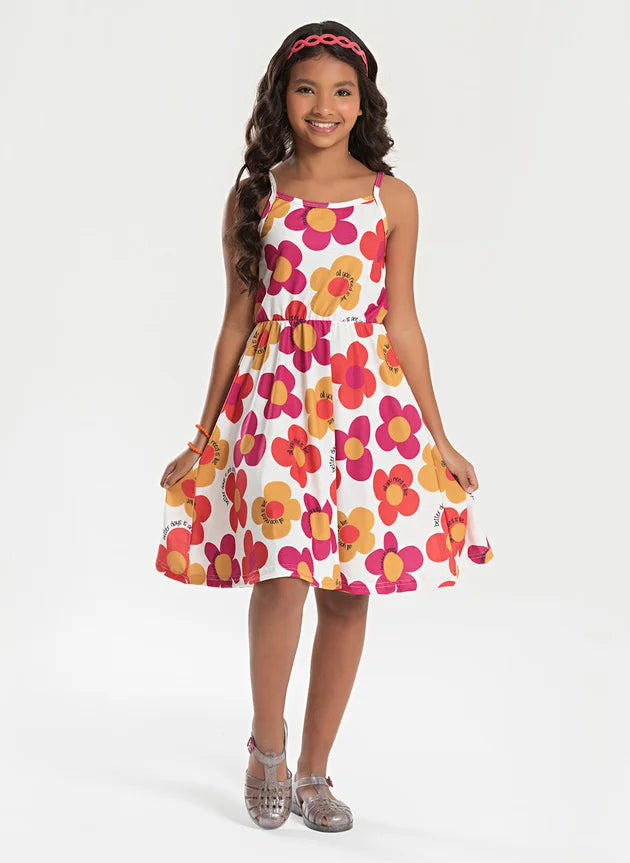 Confeccionado em poliplex com 96% poliéster e 4% elastano, o modelo é leve, fresquinho e ideal para os dias mais quentes. Com alcinhas finas, estampa sublimada de flores coloridas e cor natural delicada, o vestido ainda conta com elástico na cintura, garantindo ajuste confortável e um caimento gracioso. Um look encantador para as pequenas curtirem o verão com leveza e estilo.